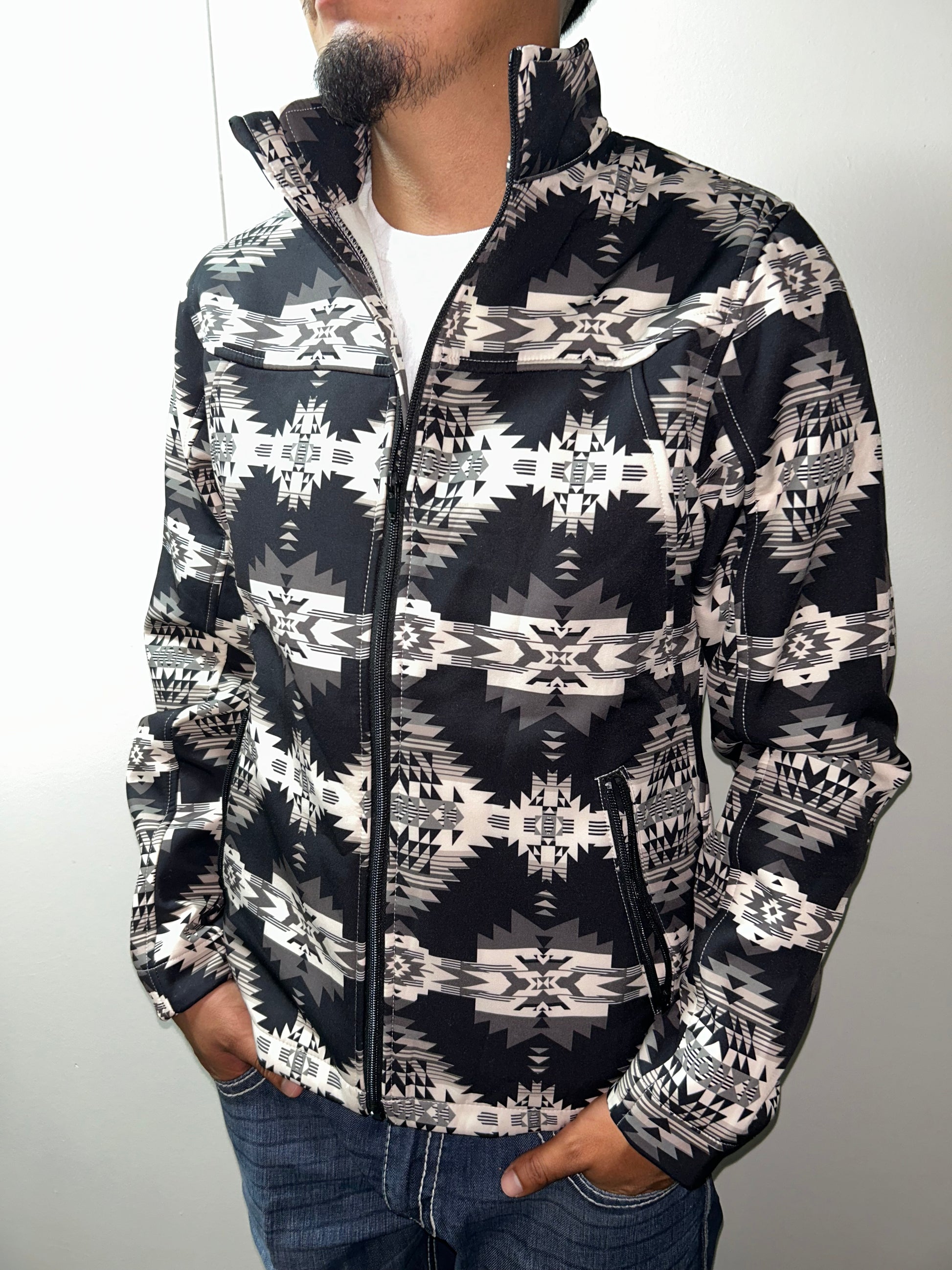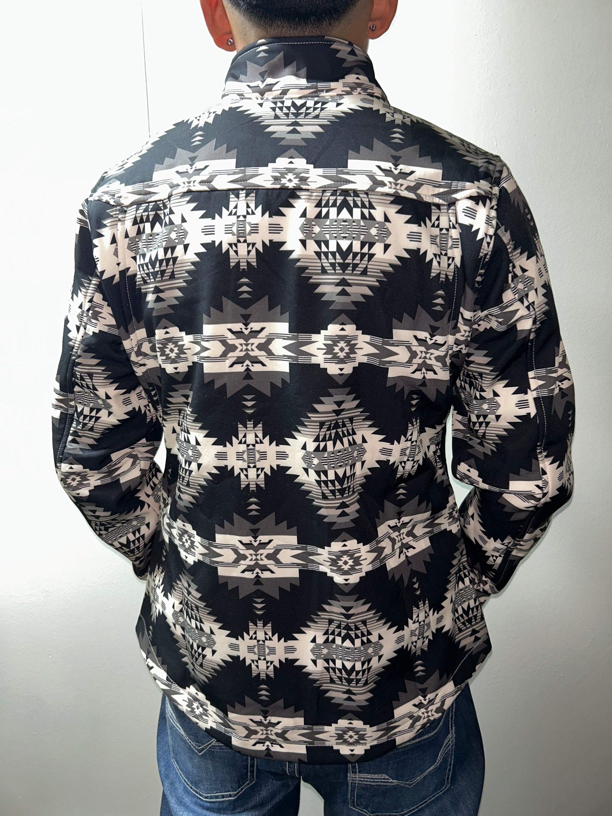 Elevate your style with the Outlaw Aztec Jacket, featuring a striking black shell paired with a sophisticated cream and gray Aztec design. This jacket blends bold patterns with modern practicality, making it perfect for city adventures or standout casual wear. Its durable fabric ensures lasting comfort and protection, while the unique design adds an artistic edge to your everyday wardrobe. Step out confidently and showcase your distinctive taste with the Outlaw Aztec Jacket.